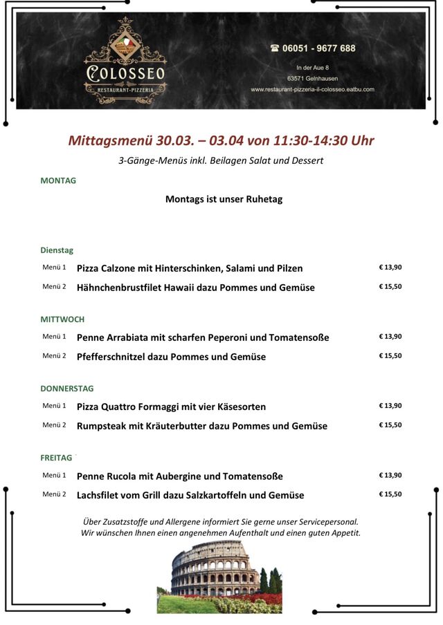 Reserve onlineWillkommen im Restaurant Pizzeria Il Colosseo im schönen Gelnhausen. Wir freuen uns darauf, Sie als Gast begrüßen zu dürfen! Wir freuen uns schon darauf, Sie in unserer Pizzaria begrüßen zu dürfen. Sie werden mit echter Gastfreundschaft und einer großartigen Auswahl an italienischen Gerichten begrüßt. Köstliche Gerichte werden hier von den besten Köchen zubereitet. Unsere köstlichen Speisen warten darauf, von Ihnen probiert zu werden. Hier können Sie auch unsere köstlichen süßen Kuchen und Torten sowie Tiramisu genießen. Wir können auf eine Vielzahl von Ernährungswünschen eingehen und bieten eine große Auswahl an laktosefreien und vegetarischen Optionen. Erfrischendes Bier, Wein, Kaffee und Tee runden Ihr Essen ab. Genießen Sie Mittag- und Abendessen in unserem stilvollen Lokal. Neben dem Essen bieten wir einen schönen Biergarten und Musik.